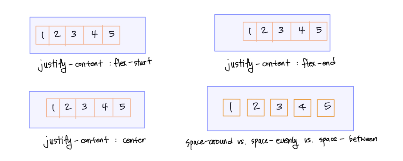flex-end, center, space-around, space-evenly, space-between 등 을 쓸 수 있다.