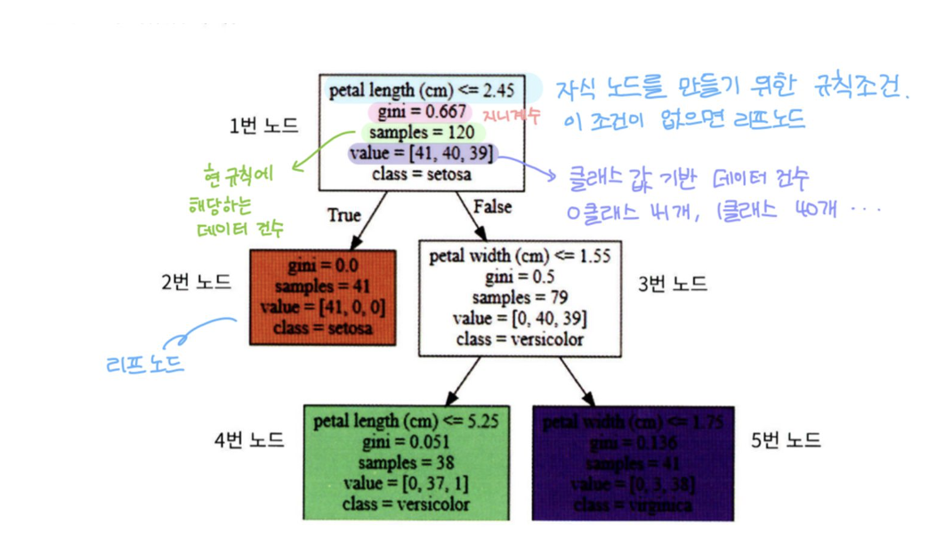 - 결정 노드는 정보 균일도가 높은 데이터 세트를 먼저 선택하도록 규칙 조건을 만든다.