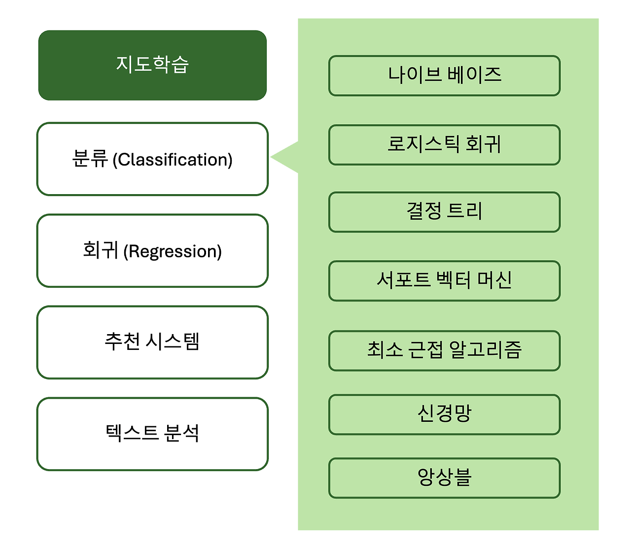 - 기존 대이터가 어떤 레이블에 속하는지 패턴을 알고리즘으로 인식한 뒤에 새롭게 관측된 데이터에 대한 레이블 판별