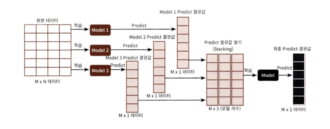 - 개별 알고리즘의 예측 결과 데이터 세트를 최종적인 메타 데이터 세트로 만들어 별도의 ML 알고리즘으로 최종 학습을 수행하고 테스트 데이터를 기반으로 다시 최종 예측을 수행하는 방식