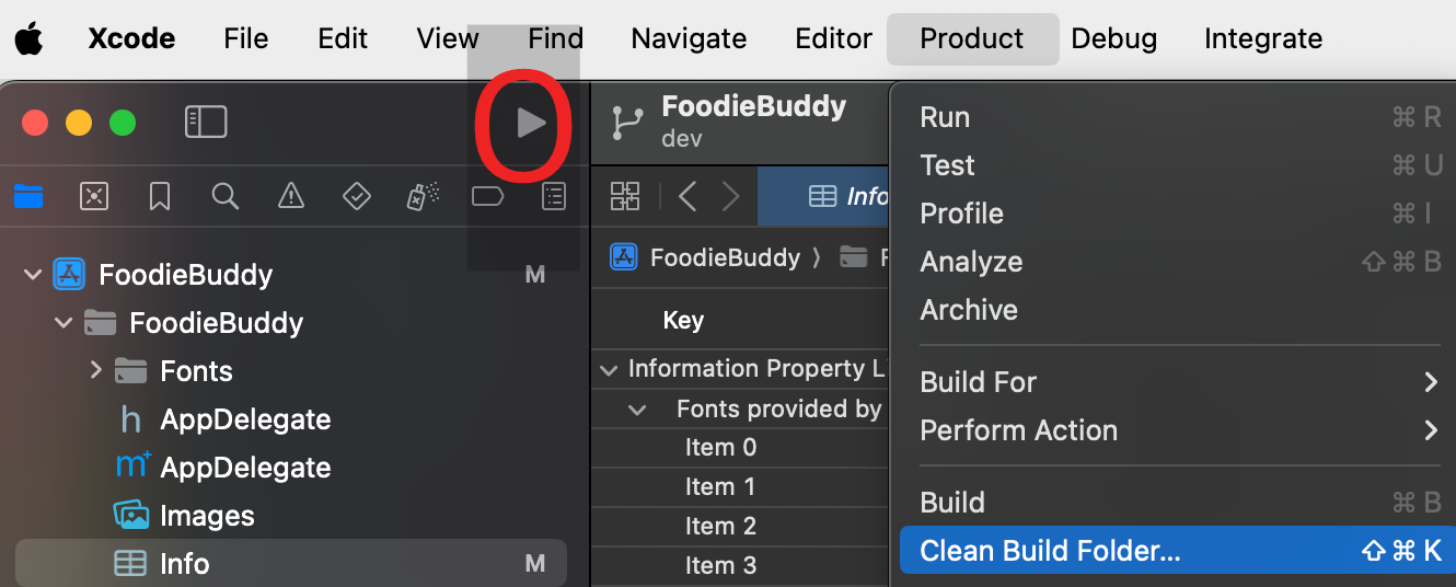 Xcode 에서 Xcode > Product > Clean Build Folder 후에 화살표 눌러 빌드