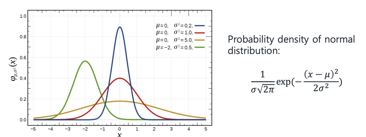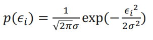 $\varepsilon_i$ 는 error 을 나타내며, 실제 값 $y_i$와 예측 값 $x_i^T\beta$ 사이의 차이를 뜻한다. 오차 $\varepsilon_i$ 는 정규 분포 $\mathcal{N}(0, \sigma^2)$를 따른다. 정규 분포를 따르기 때문에, 오차에 대한 확률 밀도 함수는 다음과 같이 가우시안 분포 식으로 표현된다.