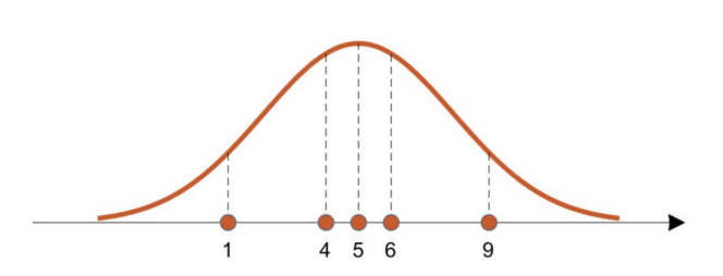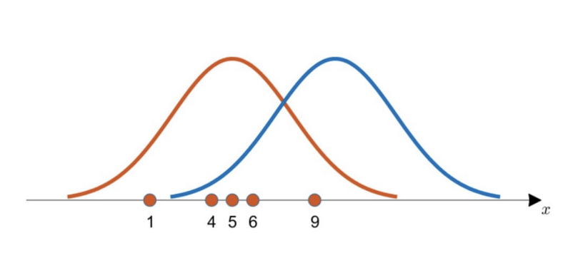 1,4,5,6,9 점이 데이터라고 할 때, 이 데이터 set 의 분포를 잘 커버하는 그래프는 파란색 보다는 주황색이다. 가장 좋은 데이터 분포를 어떻게 찾을 수 있을까? Likelihood function 을 사용할 수 있다.