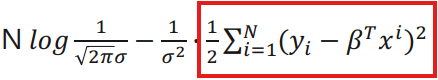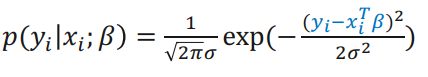 $p(y_i|x_i;\beta)$는 조건부 확률 밀도 함수로, 주어진 입력 $x_i$ 에 대해 실제 값 $y_i$ 가 나올 확률을 나타낸다. 아래 식은 $\varepsilon = y_i -x_i^T\beta$ 를 이용해 $\varepsilon$ 를 치환하여 계산한 확률 밀도 함수이다.