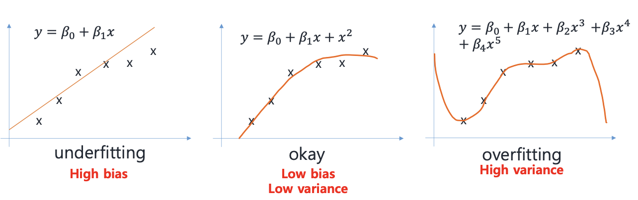 1번 모델은 예측 데이터가 중심 (실제값) 에서 멀리 떨어져 있지만, 예측값들끼리는 서로 모여 있다. 이는 bias 가 높고, variance 가 낮다고 말할 수 있다. 이러한 모델은 underfitting 이라고 말한다. 반면, 마지막 모델은 중심에서 가까운 예측값들도 제법 있기에 low bias, 하지만 서로 멀리 떨어져 있기에 high variance 라고 말할 수 있다. 이는 overfitting 이라고 한다. 결론은, low bias, low variance 인 3번째 모델이 가장 이상적인 형태이다.