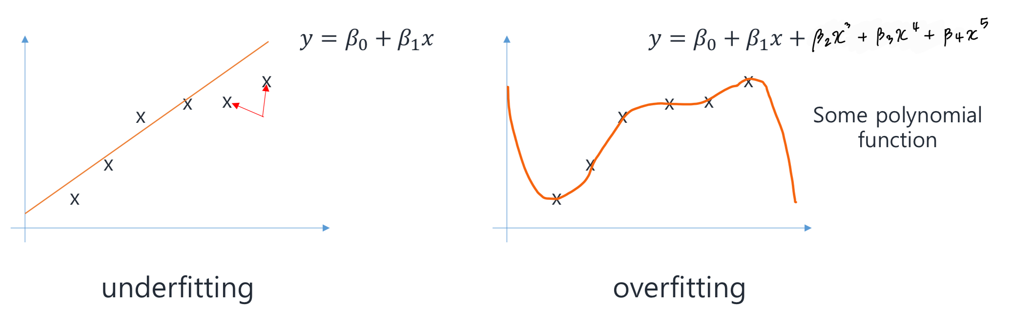 두 그래프 중 데이터를 더 잘 fit 시킨 함수는 무엇일까? 왼쪽 그래프는 직선에서 벗어난 데이터들이 2-3개 있고, 오른쪽 그래프는 모든 점을 완벽하게 커버하지만 함수 식이 매우 복잡하다. Underfitting 과 Overfitting 의 정의에 대해서는 다음 시간에 자세히 알아보도록 하고, 이번 시간에는 둘 다 바람직하지 않다는 것만 알아두자.