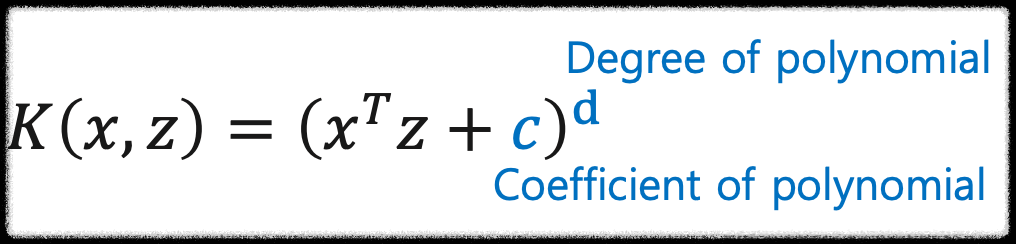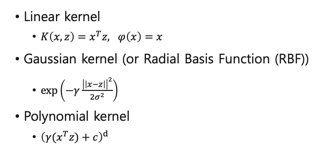 참고로 Kernel 은 SVM 에만 사용되는 것이 아니라 내적 ⟨x,z⟩형태로 표현되는 다양한 알고리즘에 적용할 수 있다. Dimension 을 증가시키는 다양한 경우에 활용될 수 있다.