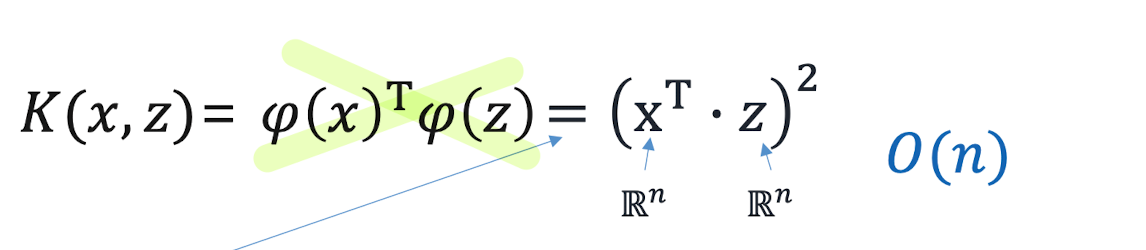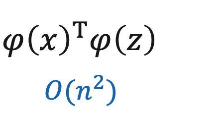 고차원 공간에서의 두 벡터 ϕ(x)와 ϕ(z) 간의 내적 $\phi(x)^T \phi(z)$ 를 계산하려면 $O(n^2)$의 연산이 필요하다. 이는 계산 복잡도가 높아 비용이 많이 든다.