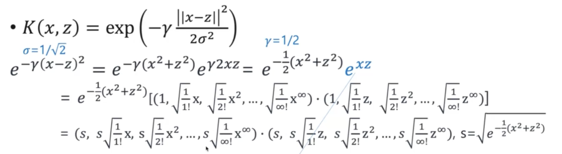Gaussian kernel 공식을 전개해보자. $e^xz$ 를 taylor series expansion 을 이용해서 계산하면, 두 개의 데이터 포인트를 내적한 모양으로 표현이 된다. Infinite dimension 이라고 계산이 복잡해지는 것이 아니라 똑같이 내적만 계산하면 되는 것이다.