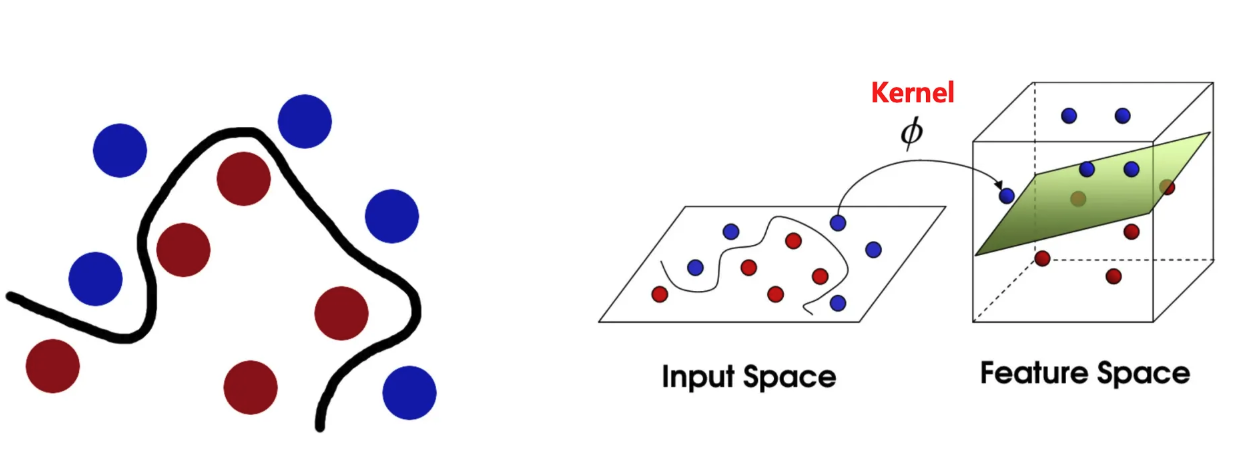 왼쪽의 그림에서는 주황색 또는 파란색 선을 그어도 missclassification 이 포함되게 된다. 여기에 한 차원들 더해서 2차원으로 만들면 적당한 구분선을 그을 수 있다. Kernel function 은 데이터를 고차원 공간으로 매핑하는 역할을 한다.