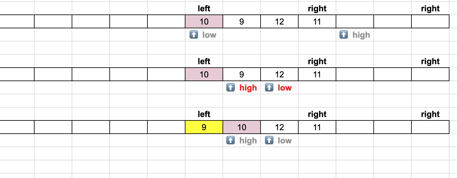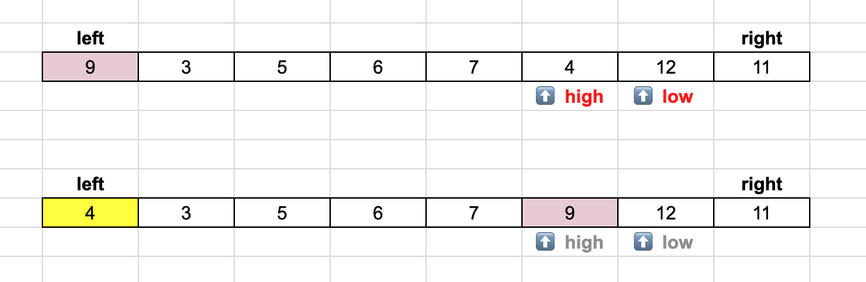 4. 그러다보면 high 와 low 가 서로를 지나쳐 가는 상황이 온다. 그 때는 left 값과 high 값을 교환하여 pivot 의 자리를 확정한다.