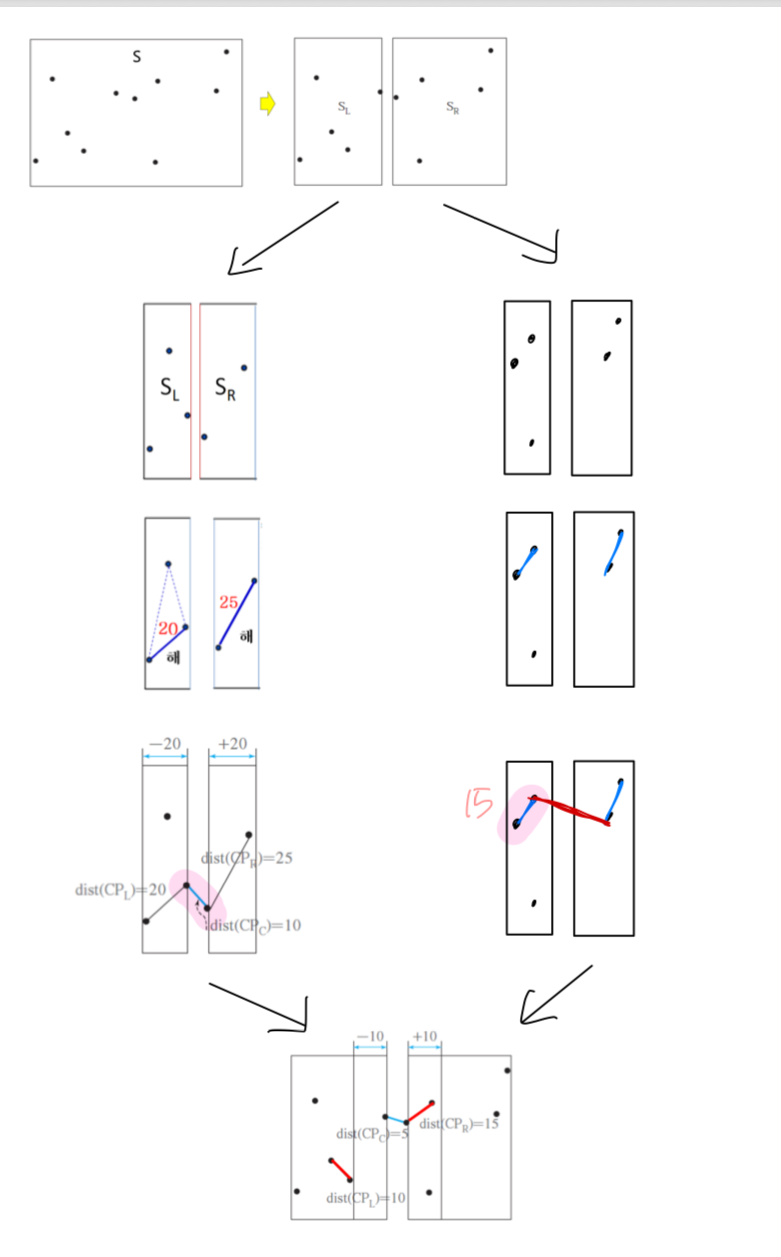 4. $CP_L$ (left 의 closest point), $CP_R$ (right의 closest point), $CP_C$ (center의 closest point) 중에서 거리가 가장 짧은 쌍을 리턴한다.