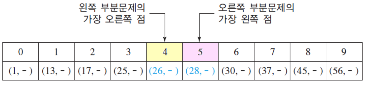 1. n개의 점을 1/2 로 분할한다 (0~4 와 5~9). 왼쪽 부분의 최근접 쌍의 거리는 10, 오른쪽 부분의 최근접 쌍의 거리는 15로 가정한다.