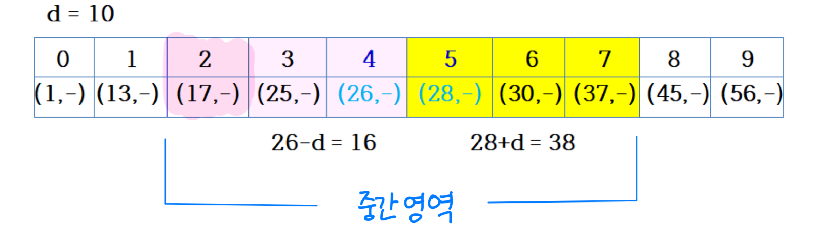 2. 왼쪽과 오른쪽의 최근접 쌍의 거리 중 더 작은 수를 선택한다 (10). 왼쪽 부분의 가장 오른쪽 점인 4번 기준으로 10 만큼 거리의 점들을 중간영역으로 포함시킨다. 오른쪽도 동일하게 진행한다.