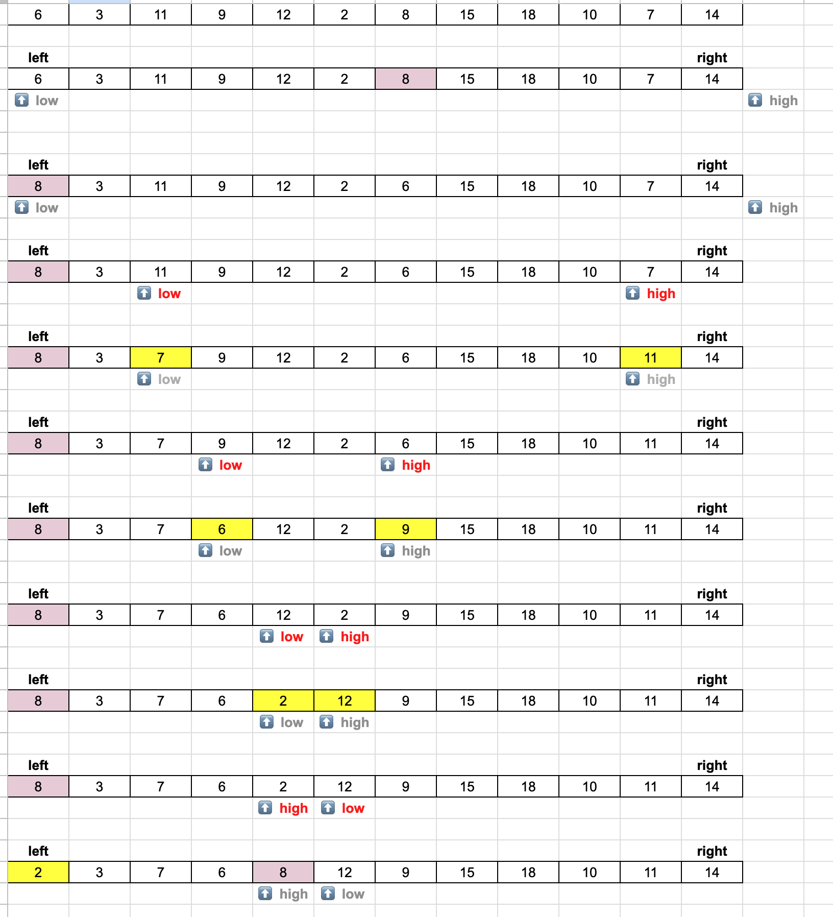 6. low, high 인덱스를 이동하는 과정을 반복하다 low 와 high 가 교차하는 순간에 left 와 high 값을 교환하는 같은 방식으로 진행한다.