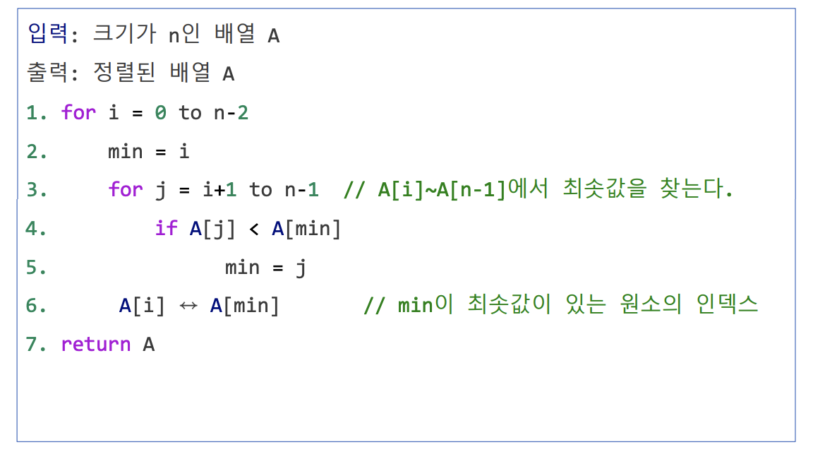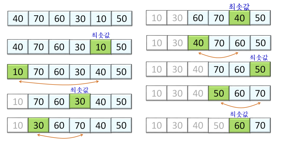 입력 배열에서 최솟값을 선택하여 배열의 0번 원소와 자리를 바꾸고, 다음에는 0번 원소를 제외한 나머지 원소에서 최솟값을 선택하여 1번 원소와 자리를 바꾼다.