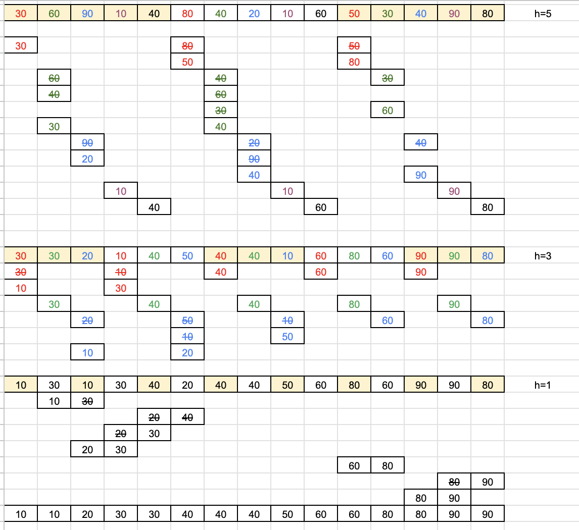 이렇게 입력을 전체적으로 1번 처리하는 것을 패스 (pass) 라고 한다. 1번의 패스가 끝나면, 가장 큰 수 (90) 이 가장 마지막에 위치하며 자리를 확정 짓게 된다.