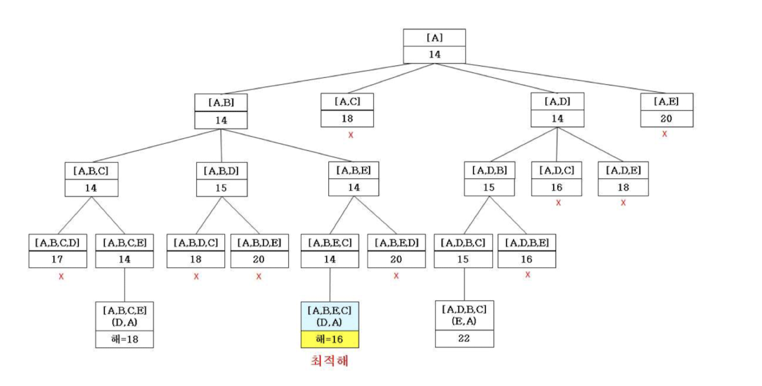 TSP 문제를 풀기 위해 백트래킹 알고리즘은 54개의 노드 방문해야 했지만, 분기 한정 알고리즘은 22개에 그쳤다. 분기 한정 알고리즘이 더 우수한 성능을 보인다.