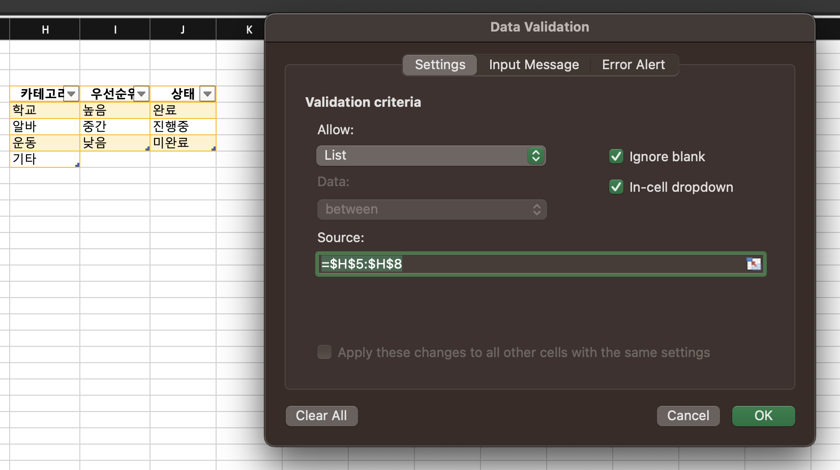 데이터 > 데이터 유효성 (Data validation) > List 형식 선택