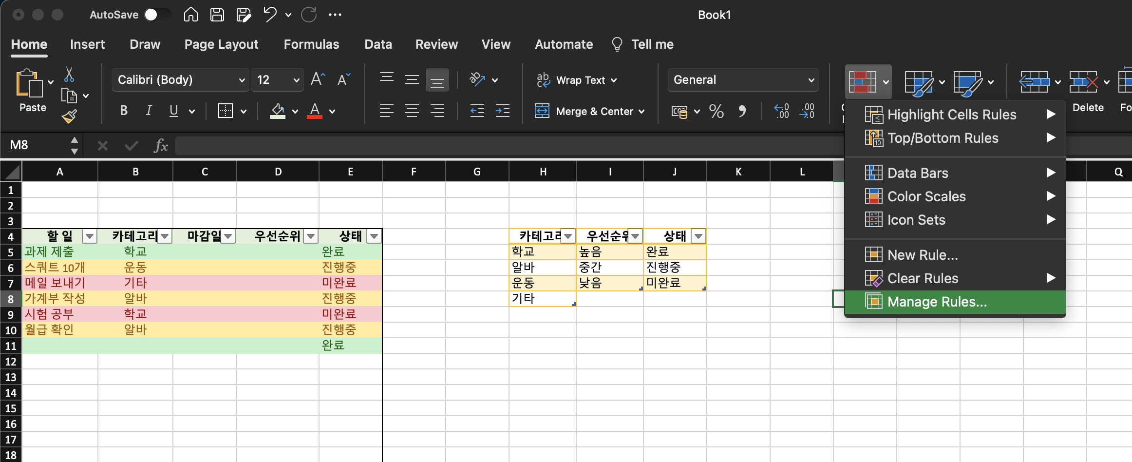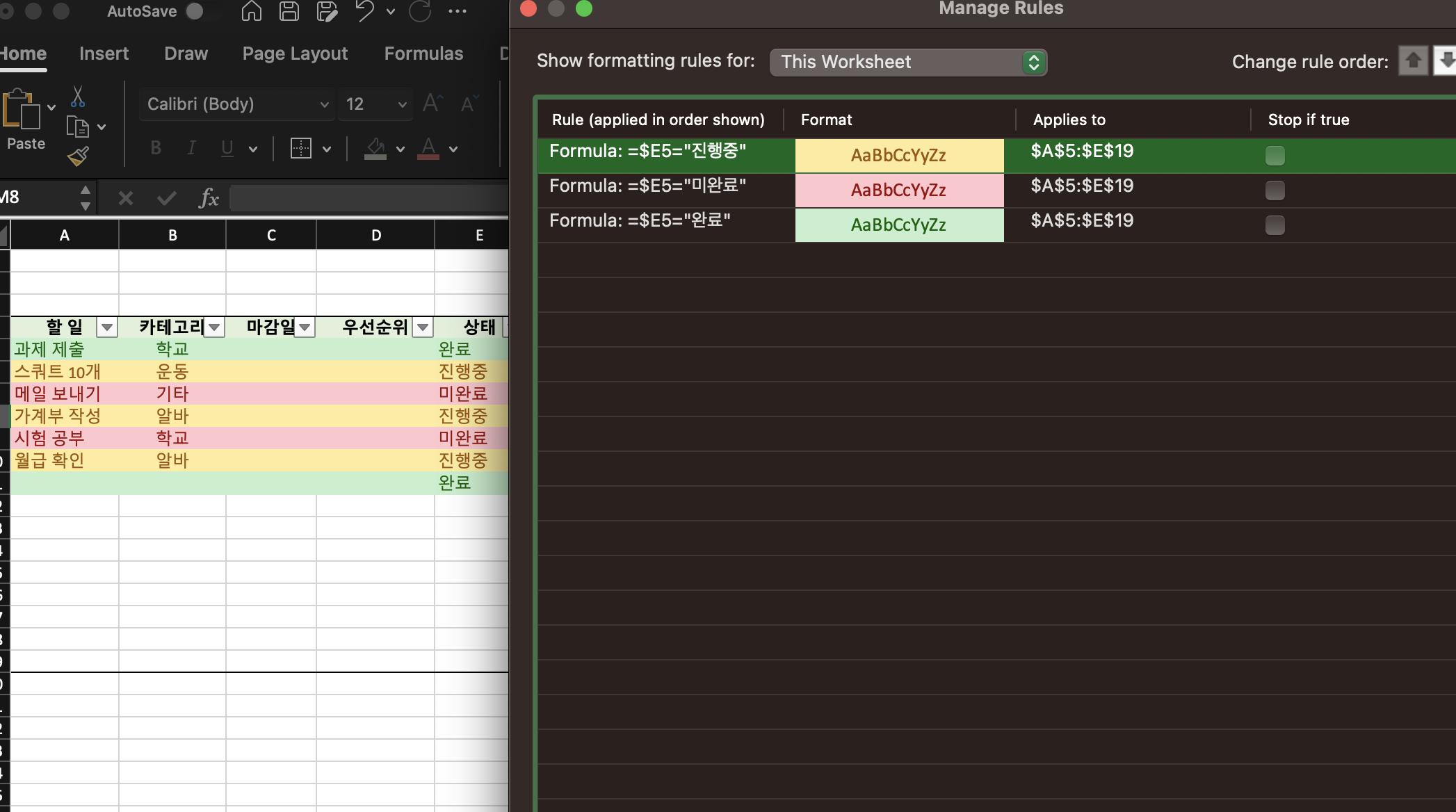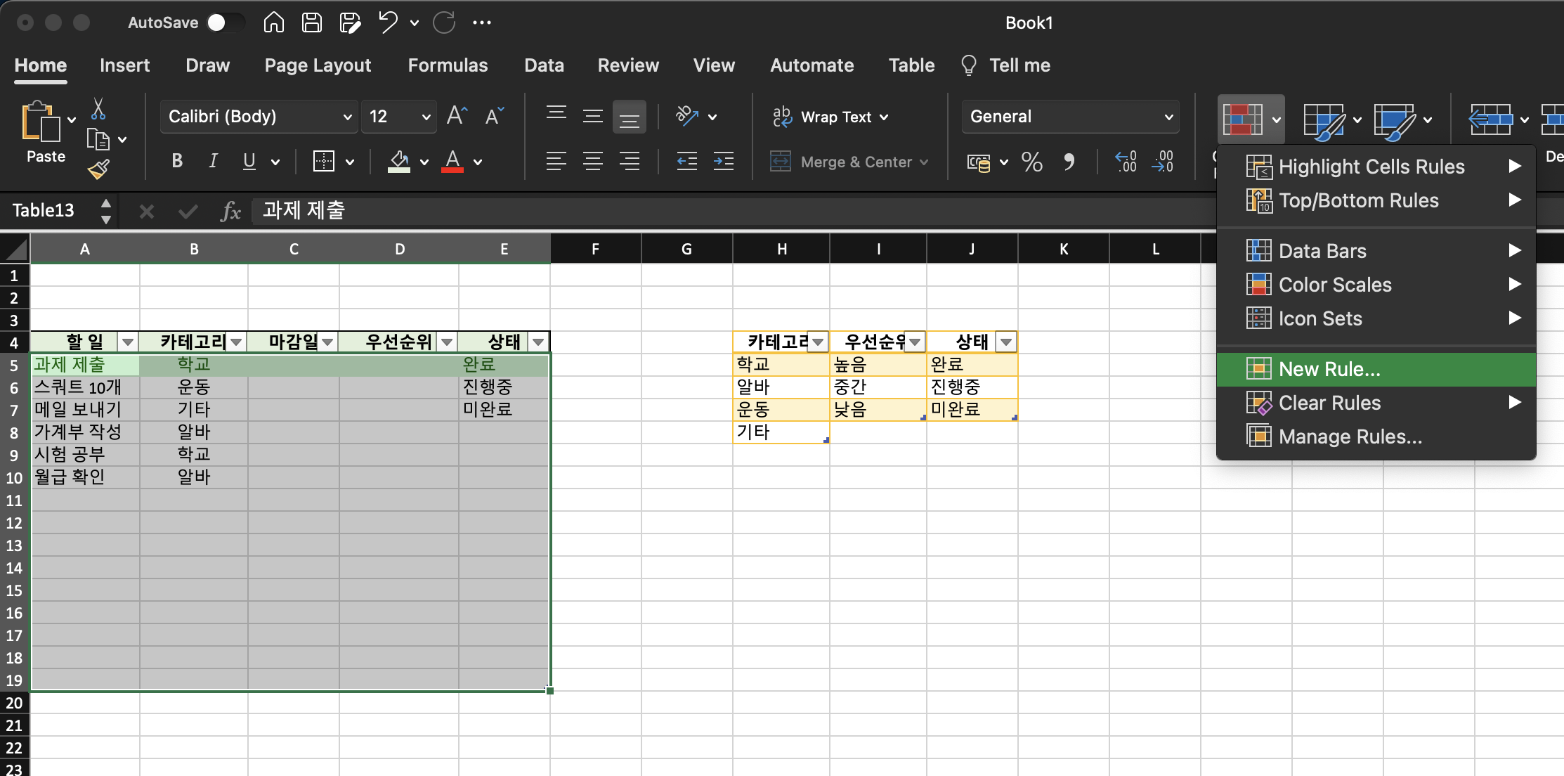 1. 전체 표 선택 후 홈 > 조건부 서식 (conditional formatting) > 새 규칙 (new rule)
