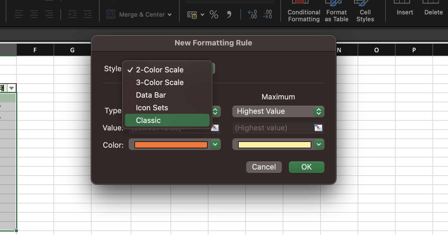 Classic > Use a formula to determine which cells to format 클릭