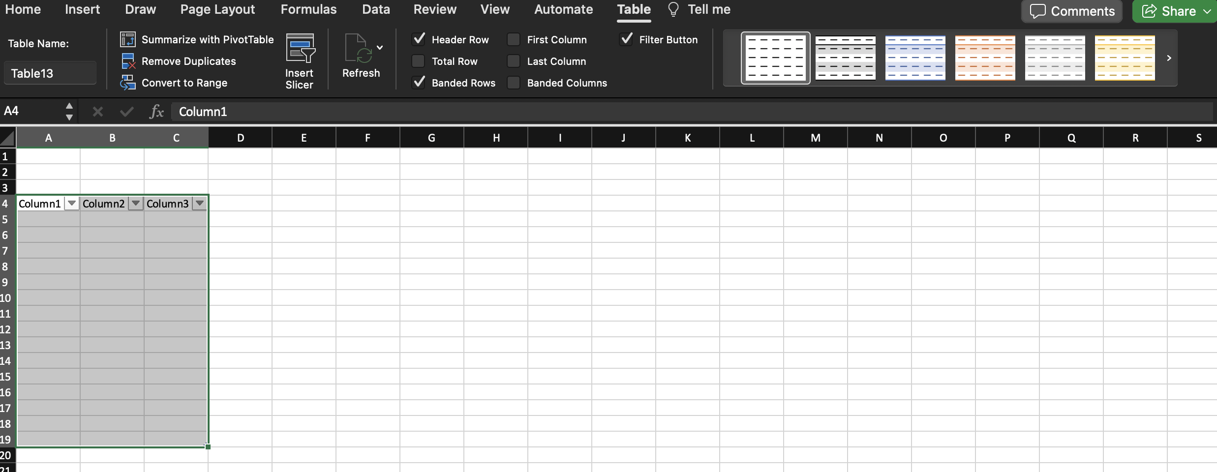 3. 상단의 테이블 메뉴를 클릭하면 디자인을 바꿀 수도 있다.